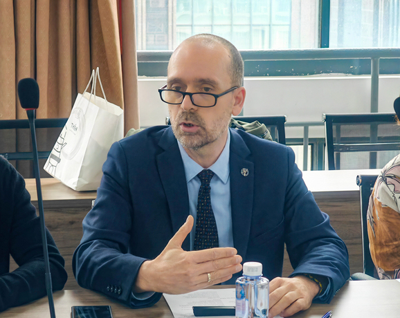 奥诺弗雷·马丁内斯院长对校方的热情接待表示感谢。他介绍,西班牙旅游产业发达,穆尔西亚大学旅游学院作为欧洲唯一将旅游学与国际关系学科并行的学院,具备深厚的学科底蕴和丰富的企业资源。学院与300多家企业建立了实习合作网络,注重培养学生实践能力和国际视野。他特别提到,穆尔西亚市市长高度重视与中国高校的合作,此次访问得到了市政府的大力支持,现场播放了市长的讲话视频,进一步体现了当地政府对此次交流的重视。此次代表团成员涵盖学院领导班子全体成员,包括教学副院长皮拉尔・洛佩斯、学生工作副院长卡洛斯・奥古斯特·皮内达、国际事务负责人胡安・罗德里格斯及专业教师代表,充分体现出对本次交流的重视与合作诚意。