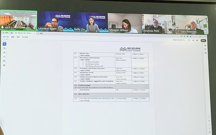 12月3日中午,我校与澳大利亚墨尔本理工学院以视频会议形式,联合召开会展策划与管理中外合作办学项目2025年度下半年联合管理委员会会议。双方针对教学计划执行、学生反馈机制等核心议题展开深入研讨,聚焦优化课程交付、强化质量保障、升级学生服务等工作,旨在进一步完善合作机制,明确下一阶段教学管理与质量提升的重点方向。